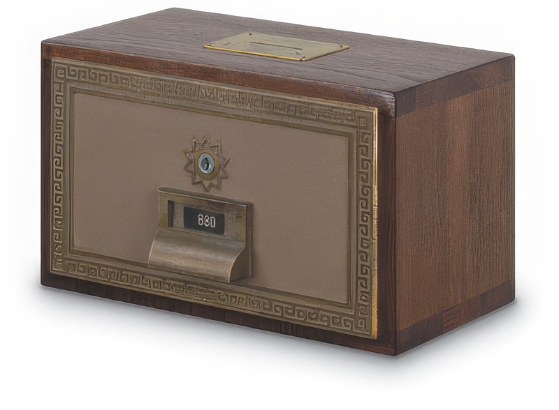 Small Collection Box Bank are ideal for placing on a Post Office desktop, or as retirement or anniversary gifts. These keepsake banks are designed with a donation slot and a standard brass door mounted to a sturdy wooden box. For security against theft, these desktop banks can be fastened to a table or into a wall through the base of the box. Please email or call for availability, limited supply only. Dimensions measure 7"H x 11 7/8"W x 6 1/2"D.