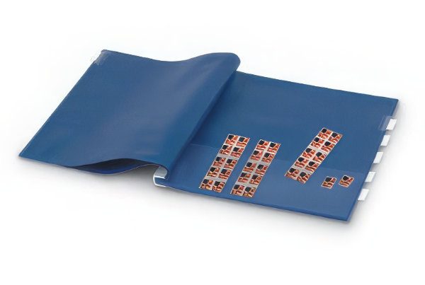 The Clear Pocket Stamp Book both stores and organizes stamps for Window Clerks. Each Stamp Book features 15 pages with vinyl pockets, 1" adhesive tabs, and screening on the front cover. Vinyl pockets are clear, displaying all contents of the pockets. Label the tabs according to the appropriate stamp denomination for each page. Extra tabs and inserts are included. Place adhesive tabs in the book specific to your needs.