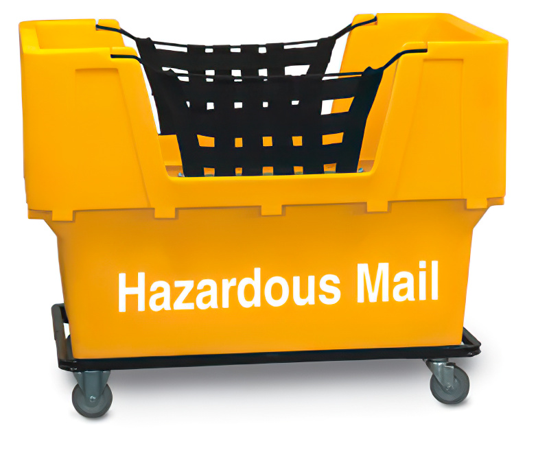 These imprinted container trucks are made to the same specifications as the 1046P cart. Imprinting on the side clearly marks the contents of the container truck. Nylon webbing can be detached making mail retrieval much easier. Trucks can be used on standard USPS dumpers. Features: High-density polyethylene; Steel frame with tow bars; Heavy-duty 4" non marking casters (2 swivel, 2 rigid); Detachable black nylon webbing; 2 sided screening. Model Numbers: N1026923 (Restricted Mail), N1026924 (Hazardous Mail), N1026925 (No Zipe Code), N1026926 (Track and Trace), N1026927 (No Postage), N1026928 (Dead Mail), N1026930 (Express mail), N1026931 (Damaged Mail).