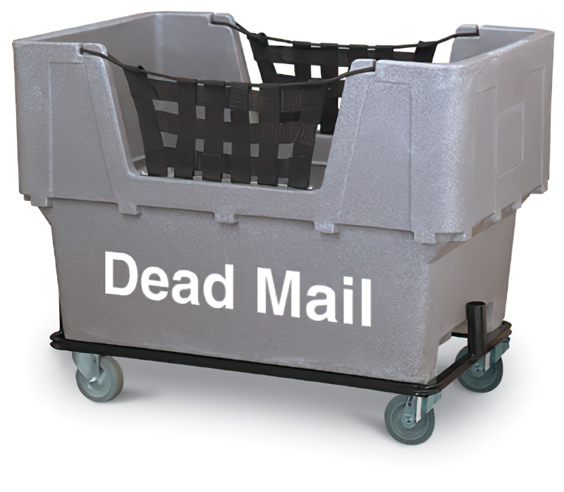 These imprinted container trucks are made to the same specifications as the 1046P cart. Imprinting on the side clearly marks the contents of the container truck. Nylon webbing can be detached making mail retrieval much easier. Trucks can be used on standard USPS dumpers. Features: High-density polyethylene; Steel frame with tow bars; Heavy-duty 4" non marking casters (2 swivel, 2 rigid); Detachable black nylon webbing; 2 sided screening. Model Numbers: N1026923 (Restricted Mail), N1026924 (Hazardous Mail), N1026925 (No Zipe Code), N1026926 (Track and Trace), N1026927 (No Postage), N1026928 (Dead Mail), N1026930 (Express mail), N1026931 (Damaged Mail).