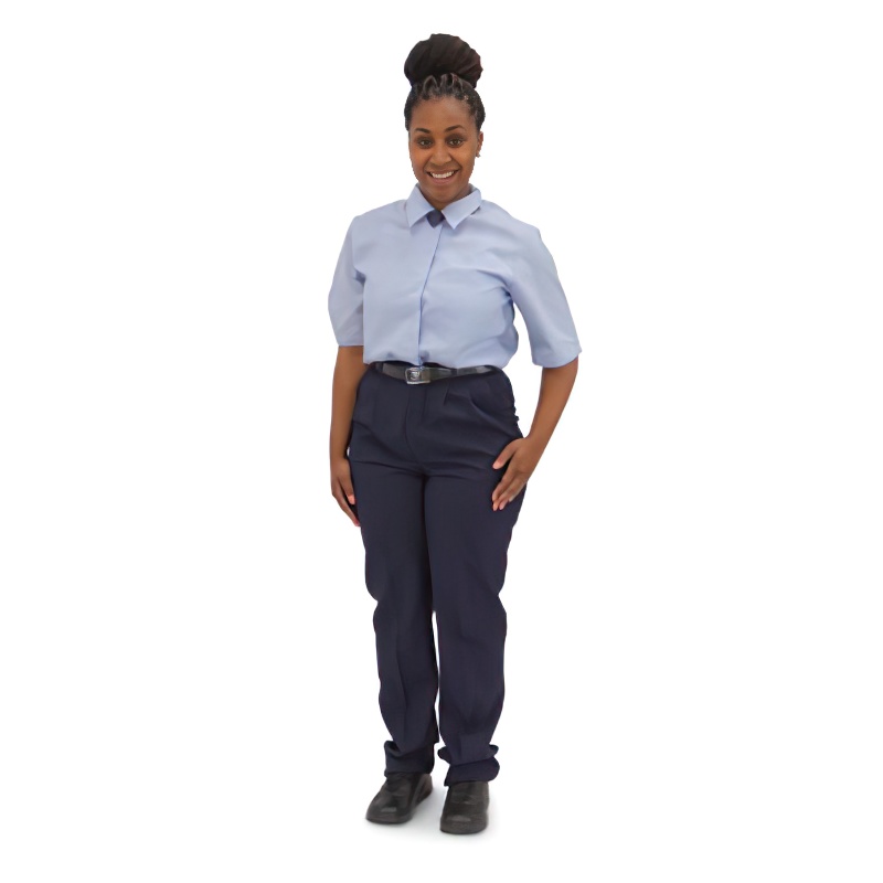 These women's Window Clerk Slacks are 100% polyester and feature a tailored, pleated front. Women's postal navy pants are also designed with a side elastic waistband with belt loops, front quarter top pockets, double welt back pockets, a front zipper, and button closure.