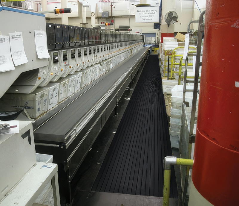 This AFSM Stacker anti-fatigue mat measures 3' x 70' and runs the entire length of the AFSM100 machine. It realizes heavy traffic as mail handlers reset bin locations. Beveled edges reduce the potential for tripping, and the ribbed surface helps prevent slips. The 5/8" material helps relieve strain on legs, back, and feet when standing for long periods of time.