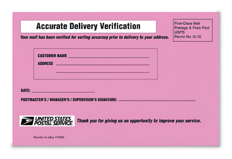 This is an example of how customers will know the USPS is dedicated to providing the best possible service. Card is included with the customer's mail, indicating steps were taken to ensure accuracy of the sorting process. Choose between cards featuring spaces for one verification signature. Use a ballpoint pen to fill in the information.