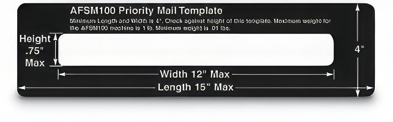 The AFSM Priority Mail Template will cut down the amount of time spent processing mail. Template is used to accurately verify if the flat is machinable or non-machinable. Necessary measurements are screened on front of every piece. Features: Black 1/4" ABS; 15"L x 4"W; Ships USPS
