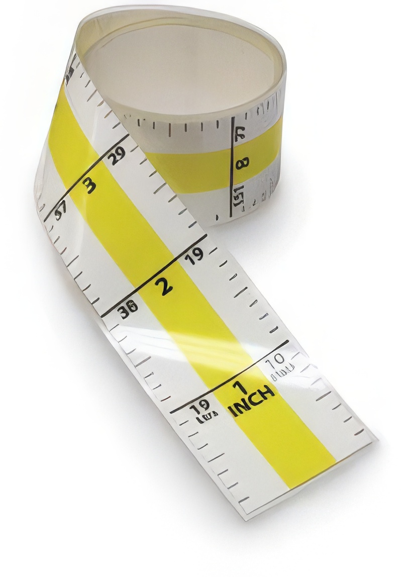 The 48" Vertical Measuring Tape is used to help postal carriers estimate how many flats or letters are in a tub as an alternative to counting the mail by hand. Place the tape horizontally on the edge of the carrier's table or vertically along the 4" sorting bin, table leg. Tape measures 48" x 1".