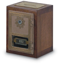 Our custom made P.O. Box Banks are ideal for retirement or collectors' gifts, as well as for in a Postal Office! The doors are authentic, antique #1 postal box doors. Instructions are included with each individual unit. With each bank, custom made for your order, please allow an extra 4 to 6 working days for assembly. Each desktop bank features a solid Pine construction, standard brass doors and measures 4 1/2"W x 4 1/2"D x 6"H. Ships USPS.