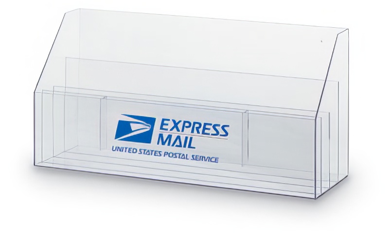 This holder can answer customer questions by itself. Made from Clear 3/16" PETG, this five compartment unit with special front pockets, show customers all Priority Mail Forms in stock. This holder can fasten to either the countertop or wall. Size is 16"W x 12"D x 15"H with front pocket dimensions 12"L x 1"W.