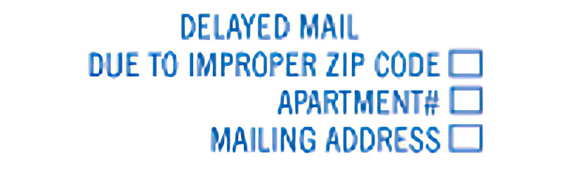 The postal labels read, "Delayed mail due to improper zip code, apartment #, mailing address"