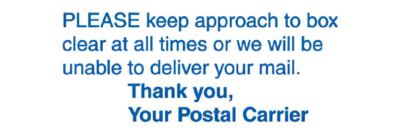 The postal labels read, "Please keep approach to box clear at all times or we will be unable to deliver your mail. Thank you, Your Postal Carrier"