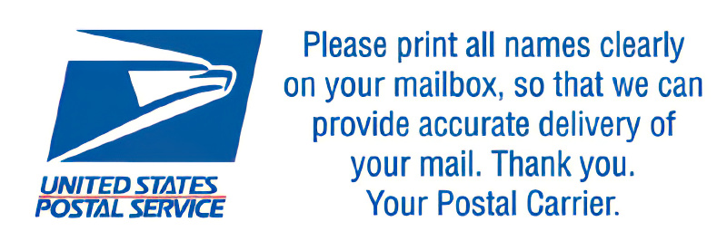 The postal labels read, "Please print all names clearly on your mailbox, so that we can provide accurate delivery of your mail. Thank you, Your Postal Carrier"