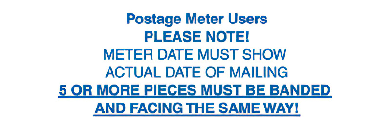 The postal labels read, "Postage Meter Users: Please note! Meter date must show actual date of mailing. 5 or more pieces must be banded and facing the same way!"