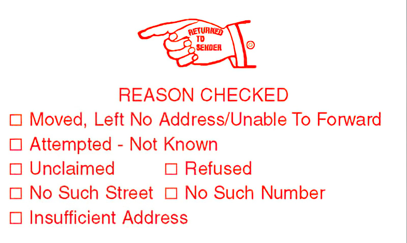 Stamp returned to sender mail with this pre-inked stamp and mark one or more of the following reasons, as shown: